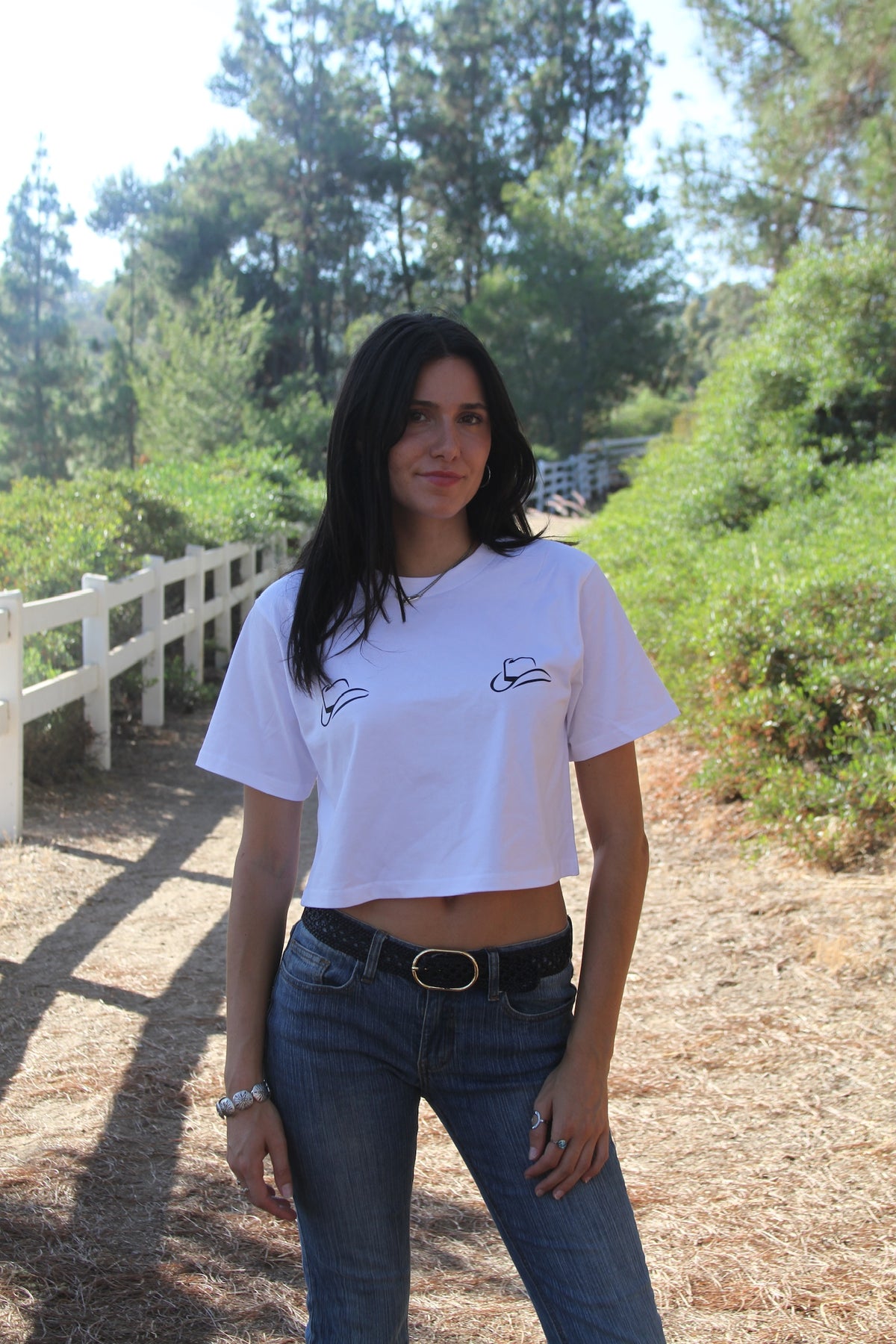 Playful yet iconic, it features two screen-printed cowboy hats placed over the chest for that effortless coastal cowgirl edge. Whether you’re headed to a concert, festival, dive bar, or just layering with your favorite denim jacket, this cropped tee was made to turn heads and keep up with your lifestyle.