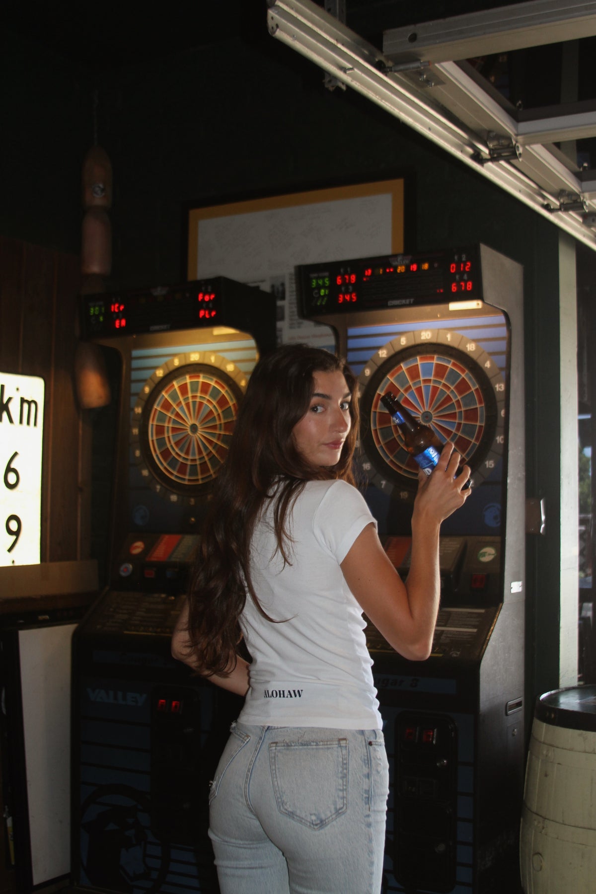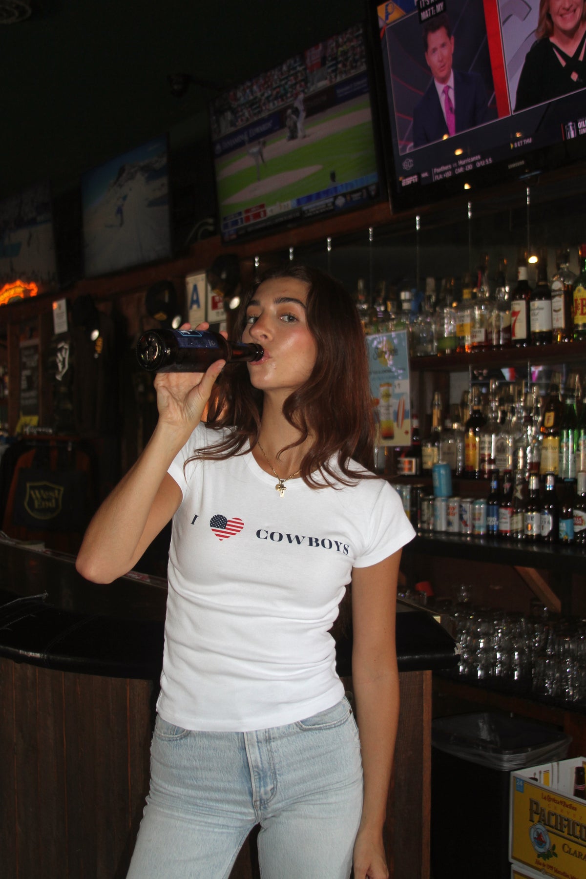 Featuring “I ❤️ Cowboys” across the front — with an American flag heart — and “Alohaw” printed on the back. It’s flirty, fitted, and perfect for styling with your go-to denim or low-rise minis.