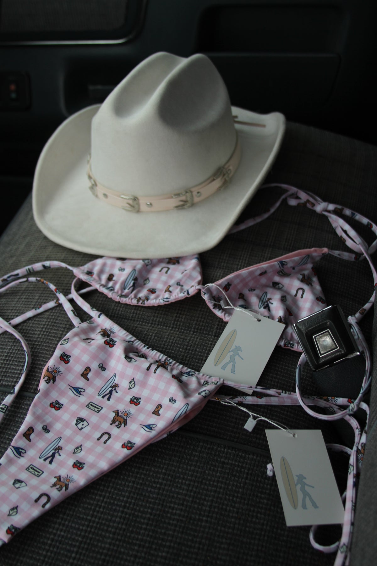 This self-tying, reversible bikini bottom is a guaranteed to turn heads. One side features our iconic custom pink and white gingham print, packed with playful coastal cowgirl illustrations — think license plates, horseshoes, the Alohaw cowgirl, heart cherries, cowboy boots, seashells, waves, and more. Flip it for a classic, soft baby pink for a totally different vibe. Designed to scrunch to the size you like!